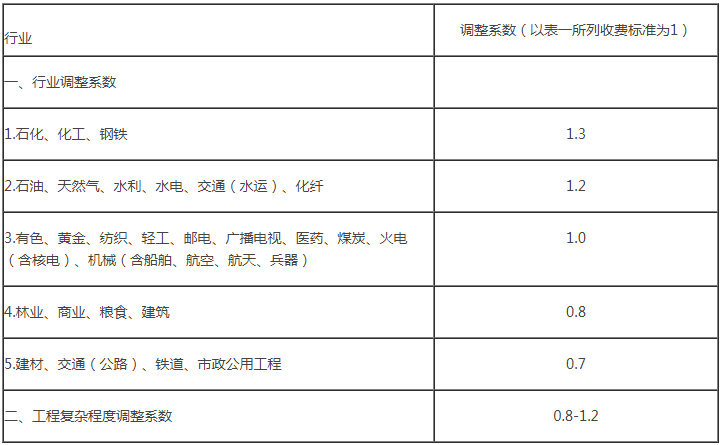 3.根據(jù)行業(yè)特點(diǎn)和各行業(yè)內(nèi)部不同類別工程的復(fù)雜程度,計(jì)算咨詢費(fèi)用時(shí)可分別乘以行業(yè)調(diào)整系數(shù)和工程復(fù)雜程度調(diào)整系數(shù)(見附件二)。