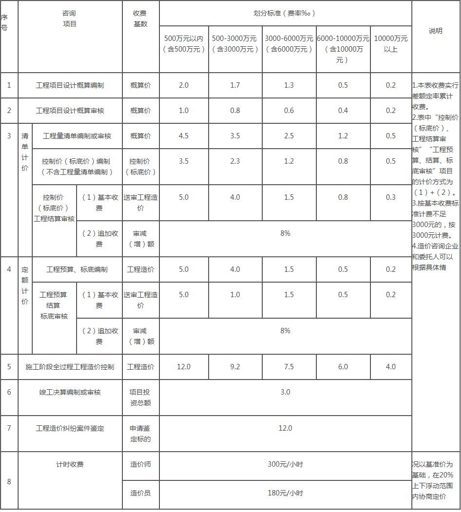 根據(jù)省物價(jià)局(委員會(huì))、計(jì)委(計(jì)經(jīng)委)計(jì)價(jià)格[1999]1283號(hào)文規(guī)定,建設(shè)項(xiàng)目前期工作咨詢收費(fèi)按建設(shè)項(xiàng)目估算投資額分檔收費(fèi),標(biāo)準(zhǔn)如下附件: