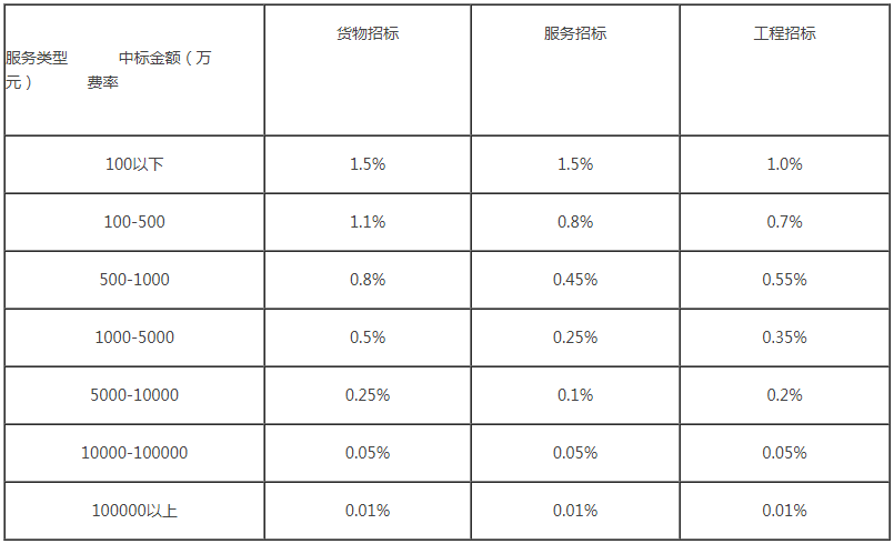 根據(jù)國(guó)家計(jì)委計(jì)價(jià)[2002]1980號(hào)文,工程招標(biāo)代理服務(wù)收費(fèi)以中標(biāo)金額為基礎(chǔ)按差額定率分檔累進(jìn)法計(jì)算,具體見下表: