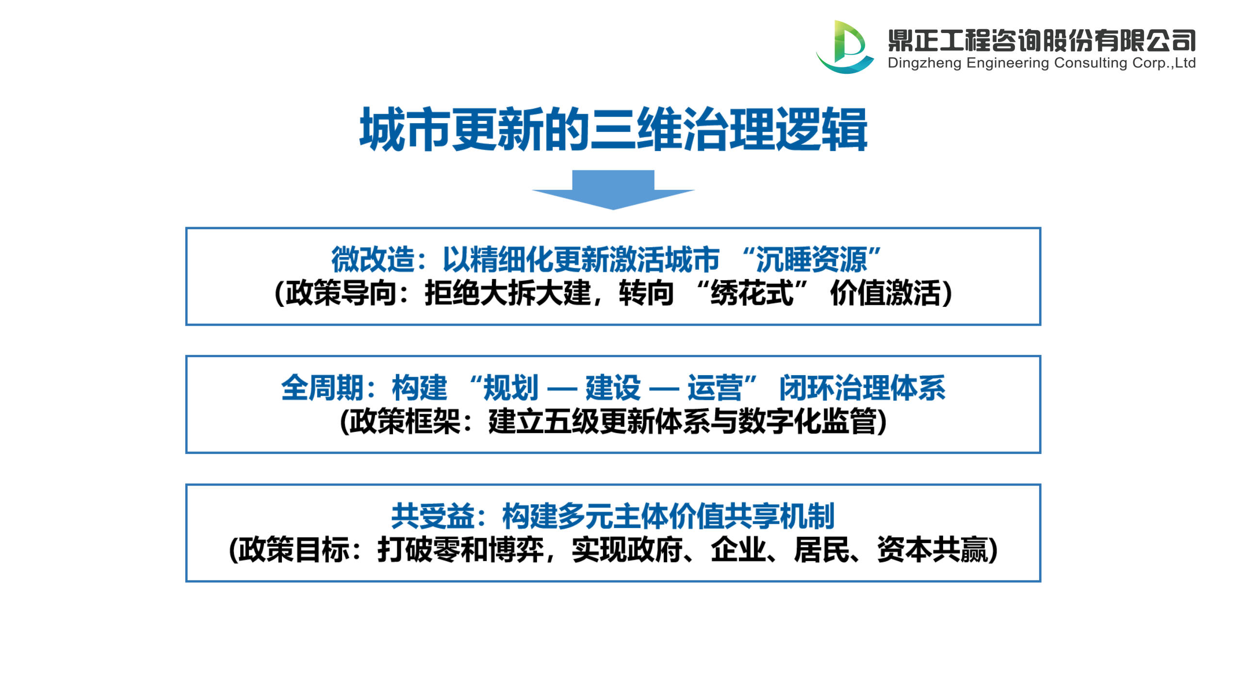 (二)全周期:閉環(huán)治理體系 《意見》提出構(gòu)建“房子—小區(qū)—社區(qū)—城區(qū)—城市”全鏈條更新體系,并通過“城市體檢—規(guī)劃引領(lǐng)—?jiǎng)討B(tài)監(jiān)管—長效運(yùn)營”機(jī)制確保系統(tǒng)性推進(jìn)。