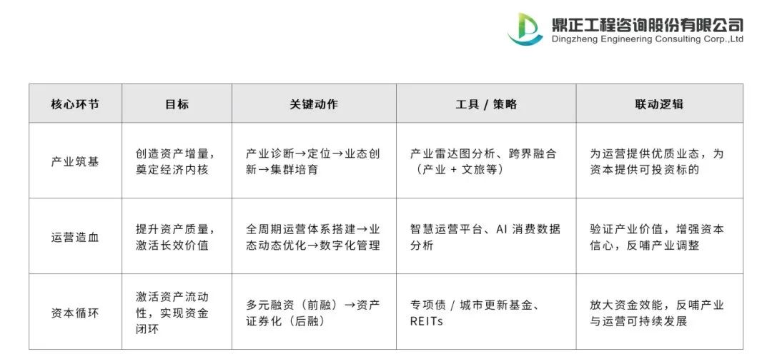 城市更新的本質(zhì)是“產(chǎn)業(yè)價(jià)值發(fā)現(xiàn) — 運(yùn)營價(jià)值提升 — 資本價(jià)值實(shí)現(xiàn)”的過程。通過產(chǎn)業(yè)精準(zhǔn)定位創(chuàng)造資產(chǎn)增量,運(yùn)營精細(xì)化管理提升資產(chǎn)質(zhì)量,資本工具創(chuàng)新激活資產(chǎn)流動(dòng)性,最終形成“產(chǎn)業(yè)筑基 — 運(yùn)營造血 — 資本循環(huán)”的可持續(xù)生態(tài),推動(dòng)城市從“空間更新”邁向“價(jià)值再生”。