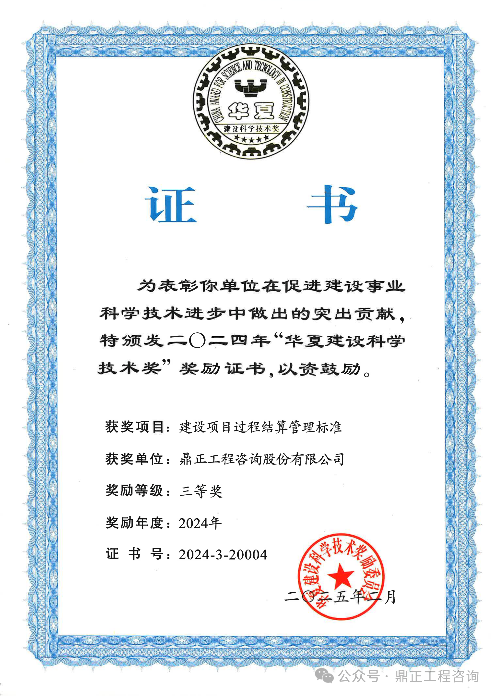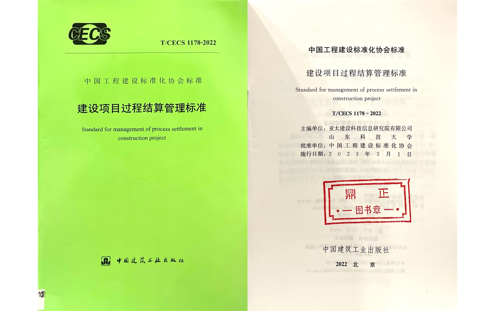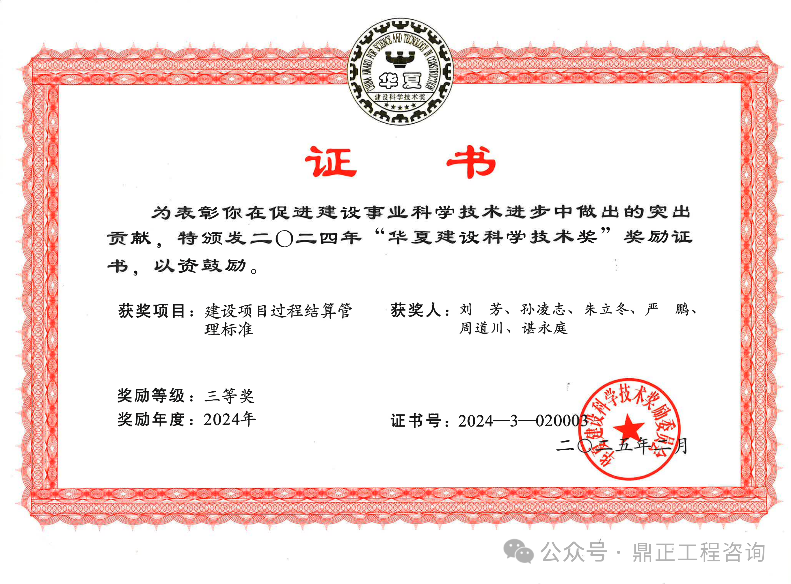 鼎正參與編制的《建設項目過程結算管理標準》(T/CECS 1178-2022)通過專業(yè)組和評審委員會的兩級評審,從700余個報送項目中脫穎而出,榮獲2024年度華夏建設科學技術獎三等獎。